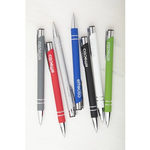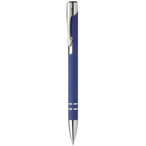 Metalen draai balpen met rubberen afwerking. Met speciale coating voor lasergravure. Blauw schrijvend.