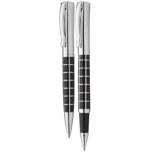 André Philippe, elegante metalen balpen en rollerpen set met chromen gedeeltes met decoraties. In PU lederen geschenkdoos. Blauw schrijvend.