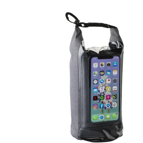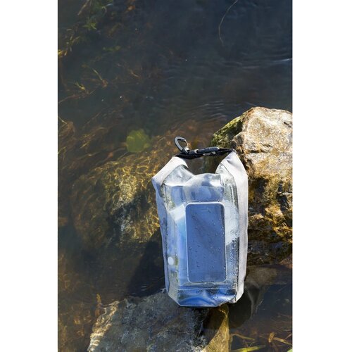 Stevige tas met een rolsluiting aan de bovenzijde. Van waterdicht PVC voor het droog houden van persoonlijke items. De voorzijde, van doorzichtig PVC, is voorzien van een extra vak voor het veilig opbergen van je smartphone. Het touchscreen kun je door het venster bedienen. De tas blijft drijven op het water en is bestand tegen waterstralen en spatten, maar mag niet ondergedompeld worden. Met kliksysteem en handige karabijnhaak voor het makkelijk aanhaken aan overige bagage of riemen. Inhoud 2,5 liter.