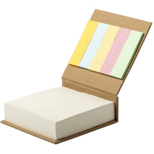 De memoblok met zelfklevende memo's is gemaakt van gerecycled karton en bevat 200 notitievellen en 125 mini-zelfklevende memoblaadjes in diverse kleuren. Gebruik de kleurtjes ook als paginamarkers. De memoblok met zelfklevende memo's heeft compacte afmetingen van 81×26×83 mm. Je kunt de omslag van de memoblok met zelfklevende memoblaadjes laten bedrukken met jouw logo, naam of ontwerp. Handig voor op het bureau en perfect om je merk dagelijks onder de aandacht te brengen.