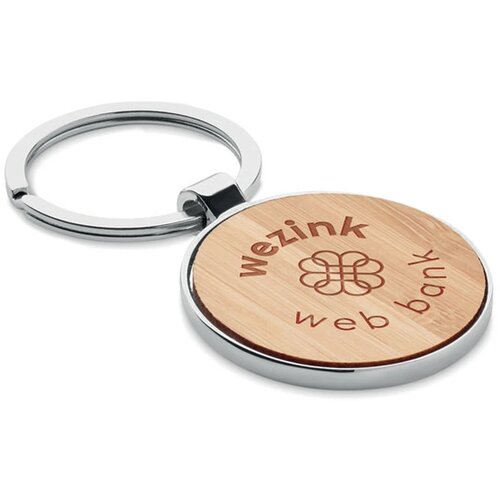 De ronde bamboe sleutelhanger combineert stevig zink alloy met een bamboe front en valt direct op door het natuurlijke materiaal. Het lichte gewicht en de solide ring maken hem ideaal voor dagelijks gebruik. Je laat de ronde bamboe sleutelhanger aan beide zijden graveren of bedrukken met jouw naam, logo of ontwerp voor maximale zichtbaarheid. Bestel snel of vraag een offerte aan.