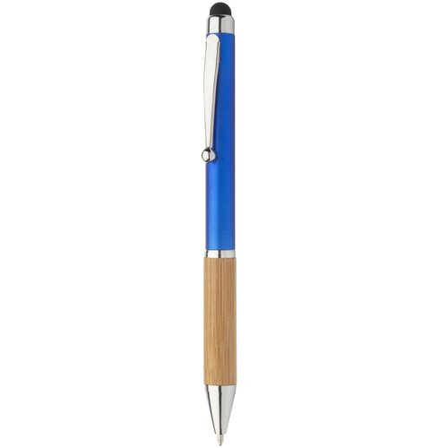 Kunststof balpen en touch screen pen met bamboe grip, metalen huls en glanzend chromen onderdelen. Blauwschrijvend.