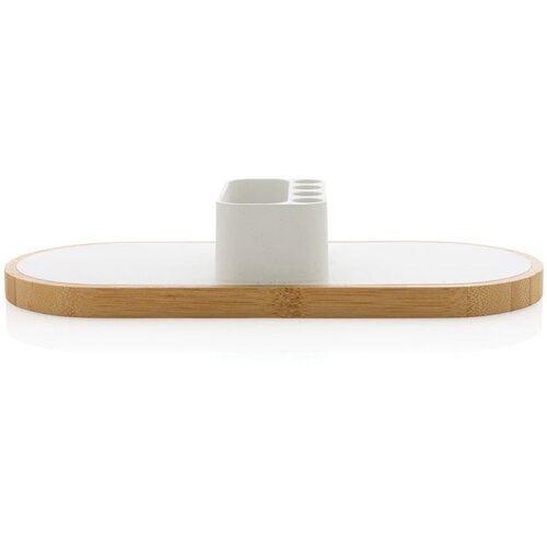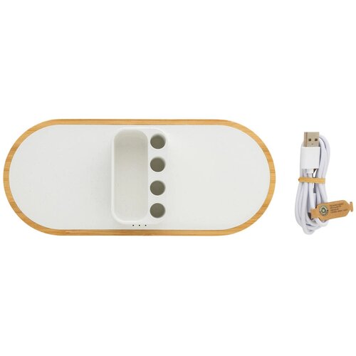 Dual 10W snelle draadloze oplader met penhouder gemaakt met RCS (Recycled Claim Standard) gecertificeerd gerecycled ABS. Totaal gerecycled materiaal: 31% op basis van het totale gewicht van het item. RCS-certificering zorgt voor een volledig gecertificeerde toeleveringsketen van de gerecyclede materialen. De basis is gemaakt van FSC®100% bamboe. Draadloos opladen compatibel met de nieuwste Android-generaties, iPhone 8 en hoger. Kan twee telefoons tegelijkertijd opladen of elk ander draadloos apparaat opladen. Met 4 pennengaten voor het opbergen van potloden en kleine opbergruimte voor visitekaartjes of andere kleine voorwerpen. Artikel en accessoires PVC vrij. Inclusief 120 cm type C laadkabel gemaakt van RCS gecertificeerd gerecycled TPE. Verpakt in FSC®mix kraftdoos. Type-C in; Ingang 5V/2A; 9V/2A; Draadloze uitgang 5V/1A;9V/1,1A; (10W) Geregistreerd ontwerp®