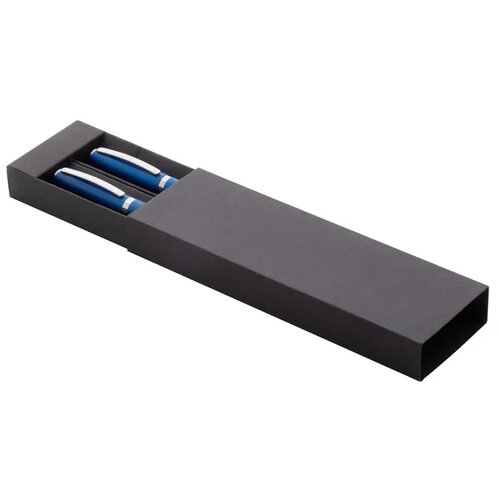 Gerecycleerde aluminium pennenset met roller en balpen in zwarte papieren geschenkverpakking. Blauwschrijvend.