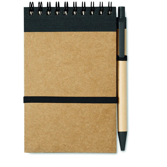 Notitieblok met 140 blanco pagina's (70 vellen) gerecycled papier, inclusief biologisch afbreekbare en gerecyclede balpen. Met elastieke sluiting. Blauwe inkt.
