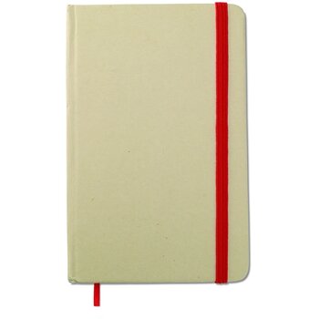 A6 notitieboekje van gerecycled materiaal, met bijpassend gekleurd bladwijzer en een elastieken sluiting. 192 blanke pagina's (96 vellen).