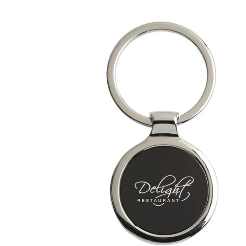 Ronde, hoogglans, nikkelen sleutelhanger met zwart metalen inlay en stevige sleutelring. Chic en exclusief. Per stuk in doosje.