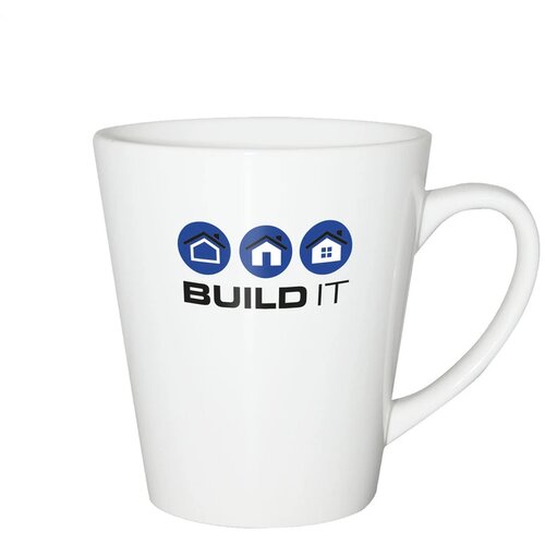 Eigentijdse keramische kwaliteitsmok. In geheel wit óf met gekleurde buitenzijde. Inhoud 310 ml. Vaatwasserbestendig. De opdruk is vaatwasmachine getest en gecertificeerd: EN 12875-2.